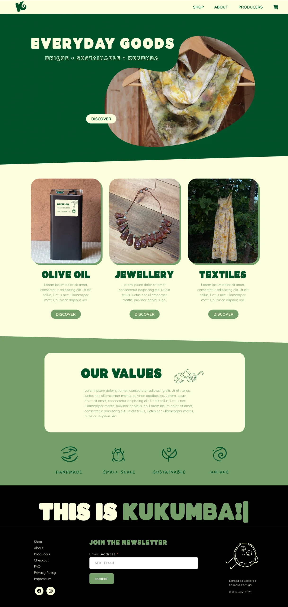KUKUMBA corporate design – e-commerce web design / for Kukumba, I designed an online store that radiates personality. The platform brings together handmade, one-of-a-kind everyday products from small makers – a charming alternative to mass production. The design combines a playful aesthetic, fresh color palette, clear structure, and witty hand-drawn illustrations to create a shopping experience full of charm, warmth, and character. / 2025
