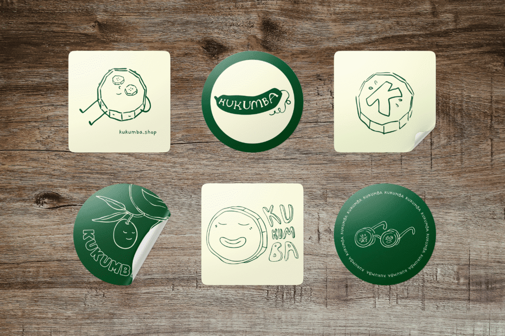 KUKUMBA corporate design – stickers / to enhance Kukumba’s visual identity, I created a series of stickers. Featuring playful motifs, the illustrations add a humorous touch and emphasise the brand’s distinctive personality. / 2025